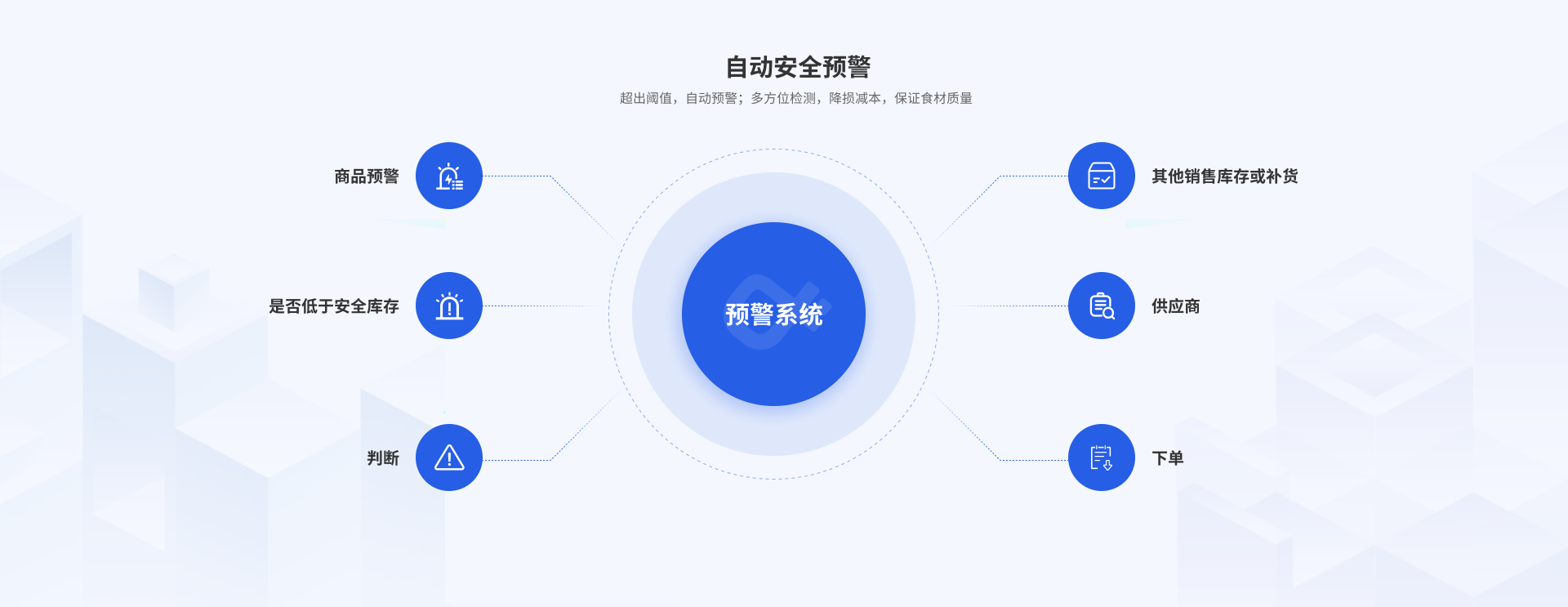 对商品、仓储、订单、供应商自动预警,降低库存损耗,减少采购成本
