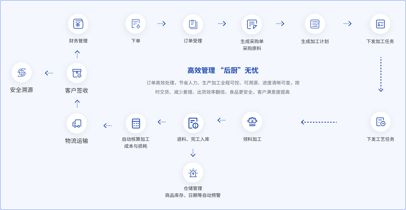当前业务规模、交易规模、仓库商品吞吐量、加工、分拣、 配送、安全溯源检查等进度清楚把控。 采购、生成、出入库一体化管理,无缝衔接,降低库存成本。 手机数据自动同步系统,全程信息化,科学管理生产加工进 度, 任务流转更高效。